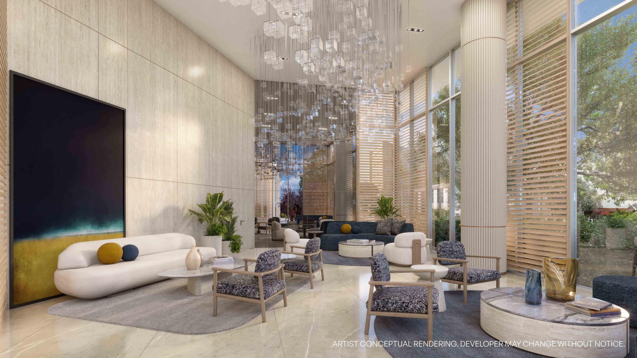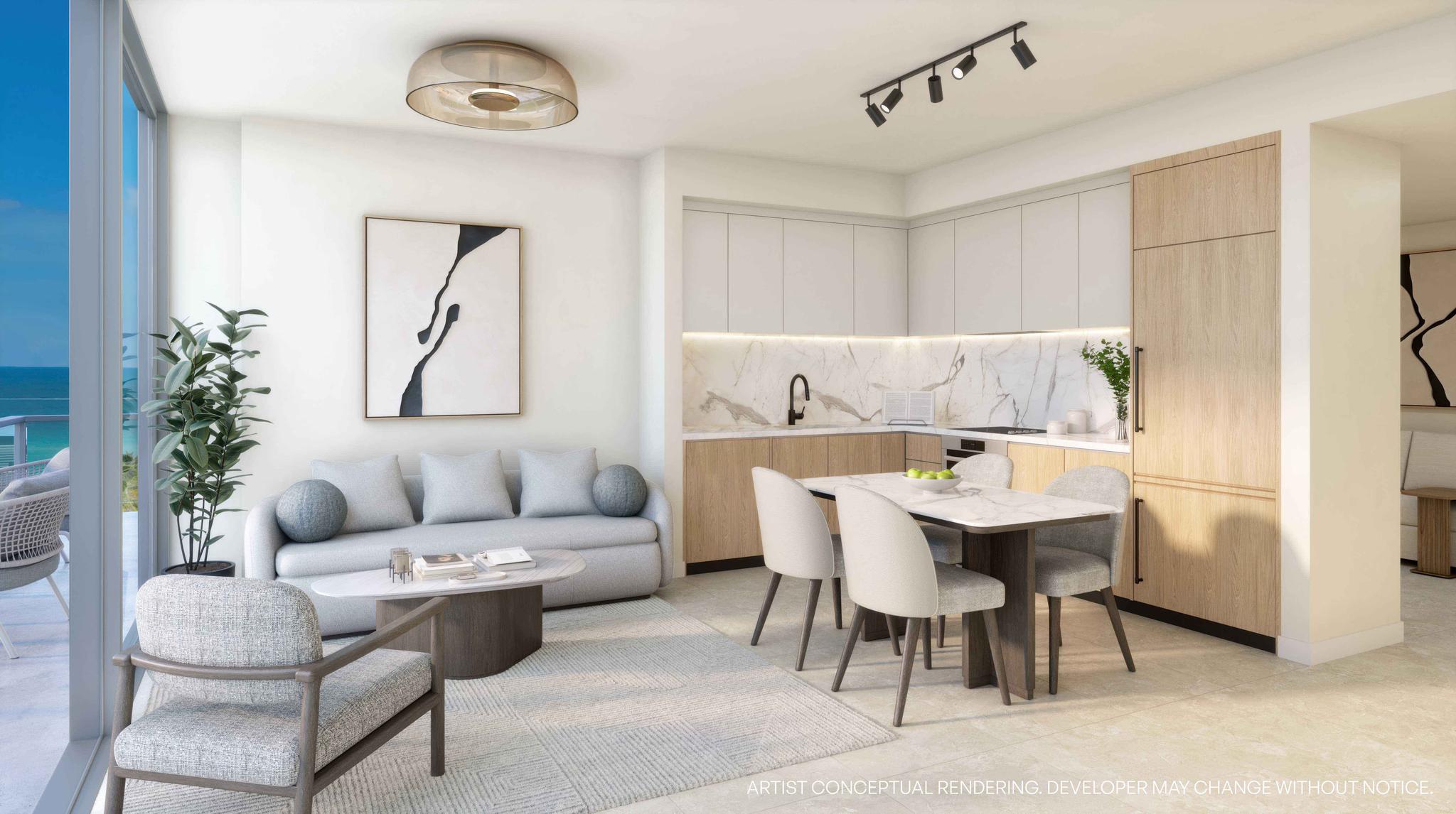 Developed by Northlink Capital and designed by the acclaimed Revuelta Architecture International, 7200 Collins is defined by its fluid lines and ocean-facing form. The building’s signature curved façade allows for panoramic views and sunlight to permeate each residence, while glass-wrapped balconies connect the indoors to the natural beauty outside. Inside, interiors by Adriana Hoyos Design Studio bring warmth and sophistication to every detail, from Italian cabinetry and glazed porcelain tile flooring to bespoke furnishings selected for modern, elevated living.
