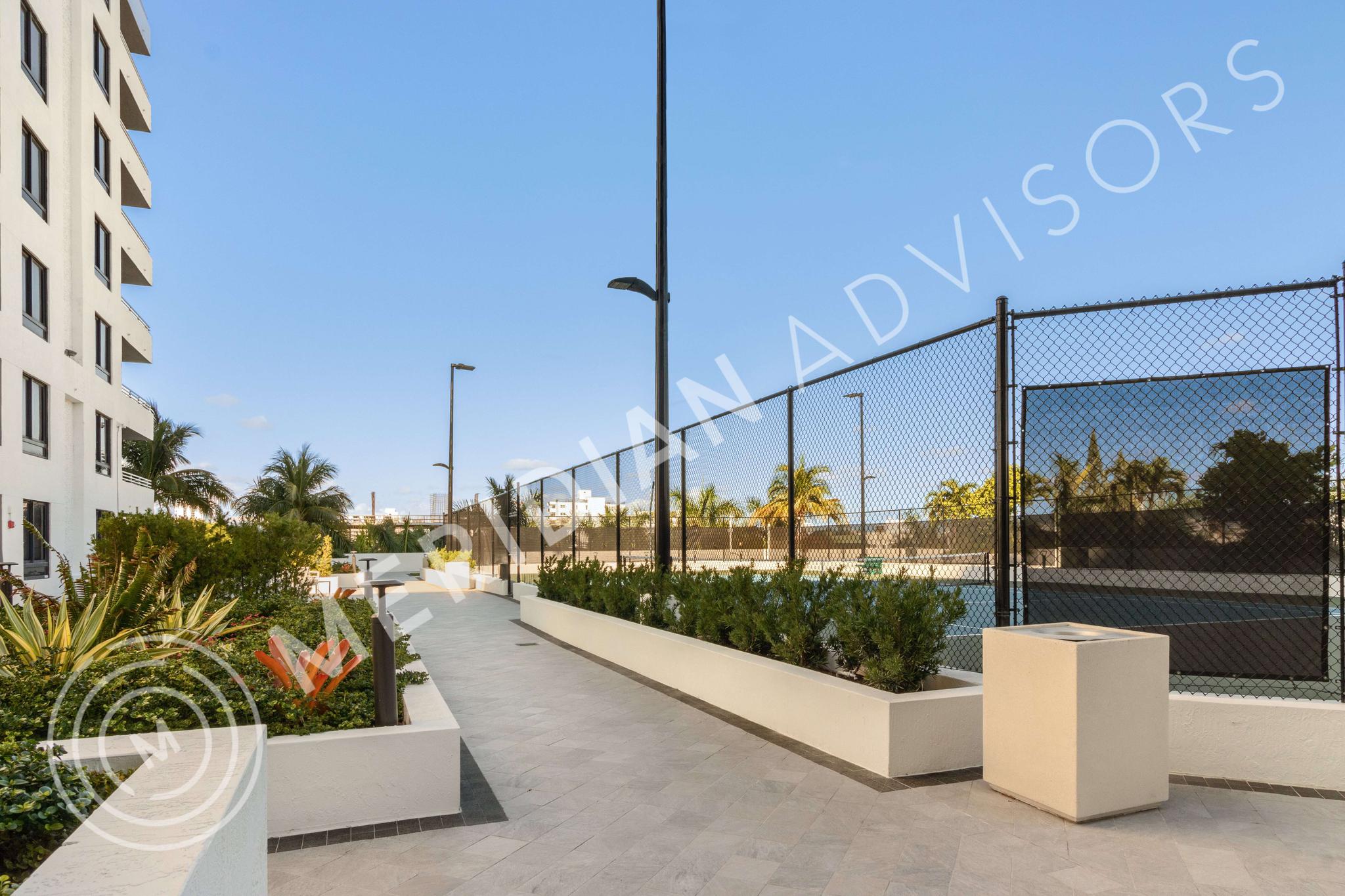 This deck is beautifully landscaped and includes a lighted tennis court with its own pavilion, a lap pool, a fully equipped enclosed gym, and various party rooms, providing a comprehensive living experience for residents.